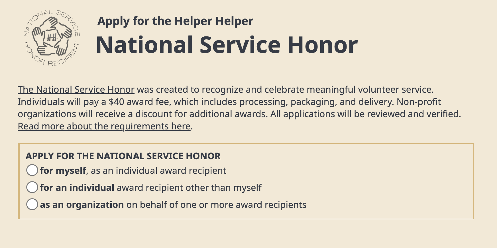 No. While Helper Helper makes tracking hours easier, it’s not required. To apply, you simply need an organization that can certify your volunteer hours.